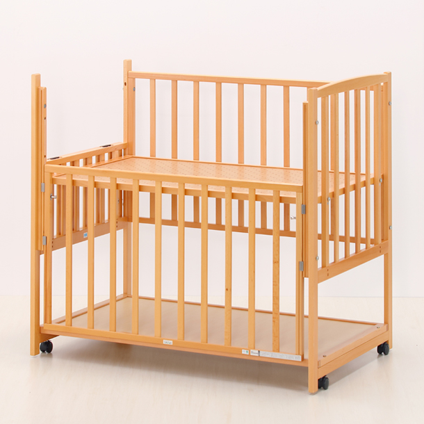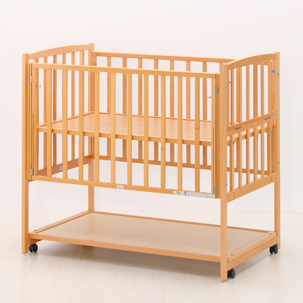 赤ちゃんのケアは、かがんだ姿勢になるので、出産後間もないママには大変。このベッドは高さ調節機能があり、床板の高さを床から約70cmまで調節できるので、お母さんの負担を大きく軽減させられます。