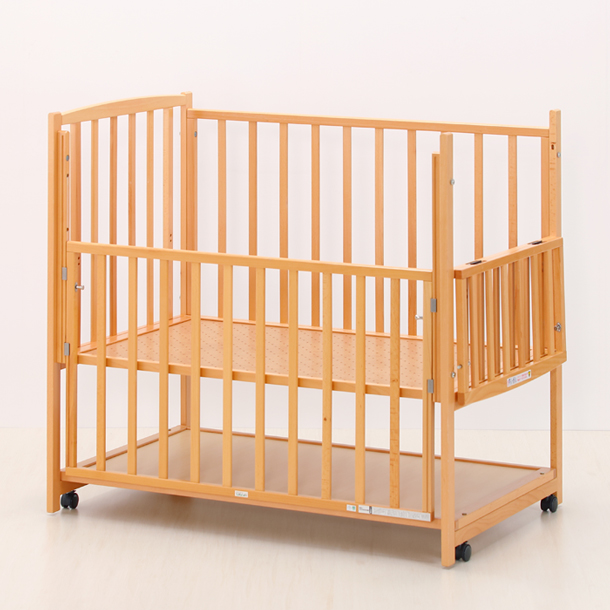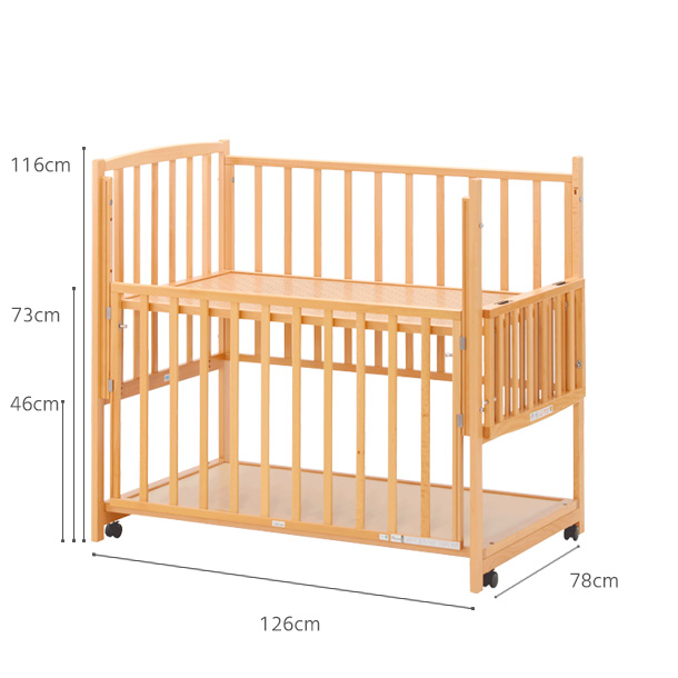 しかも、ベッドの前横の両枠が開閉できるので、オムツ替えや開閉がラクラク。